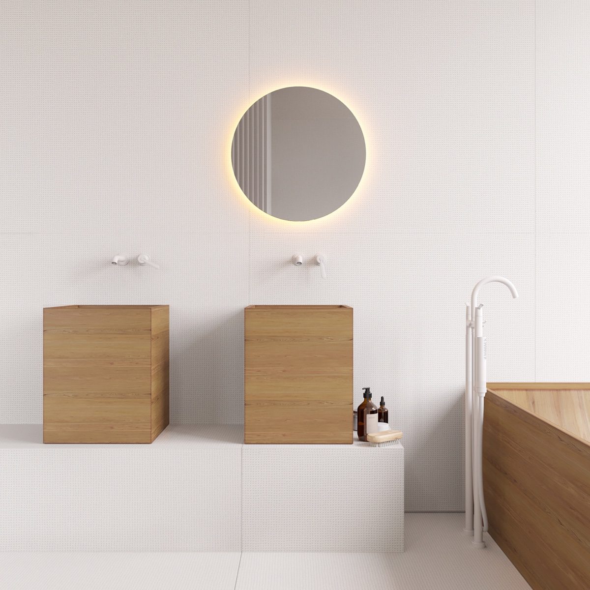 帶有 LED 背光的圓形鏡子看起來有點(diǎn)像太陽,為房間增添了深度。你見過木質(zhì)浴缸嗎?它不僅看起來令人放松,而且還為房間帶來了生機(jī),因?yàn)樗c豪華的男女設(shè)施相結(jié)合。