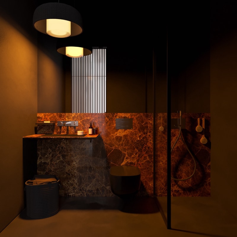 主浴室反映了臥室較暗的內(nèi)部。大理石瓷磚打斷了深色配色方案,看起來很迷人。玻璃隔間淋浴間保持空間整潔,并提供不間斷的地板視圖,給人一種更大的地板空間的錯(cuò)覺。一個(gè)古老的設(shè)計(jì)技巧在這里完美展示。