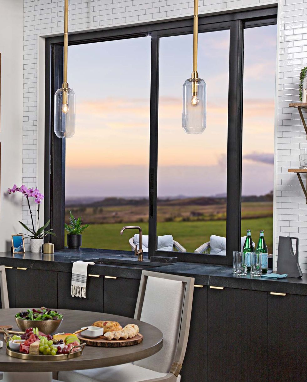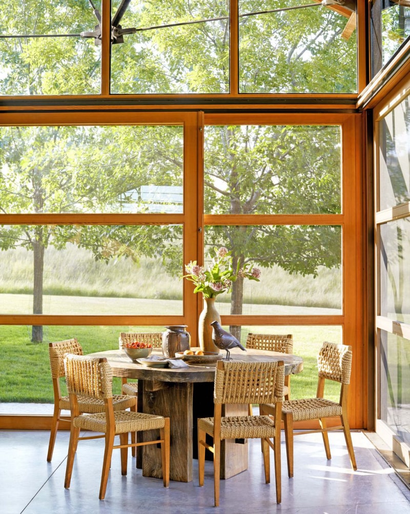用雙折窗將您的餐桌打開到戶外。在兩側(cè)擴(kuò)展一張桌子,就像在這個房間里一樣,或者簡單地在露臺旁添加一張桌子以簡化設(shè)施。
