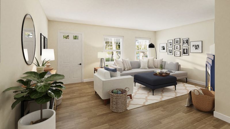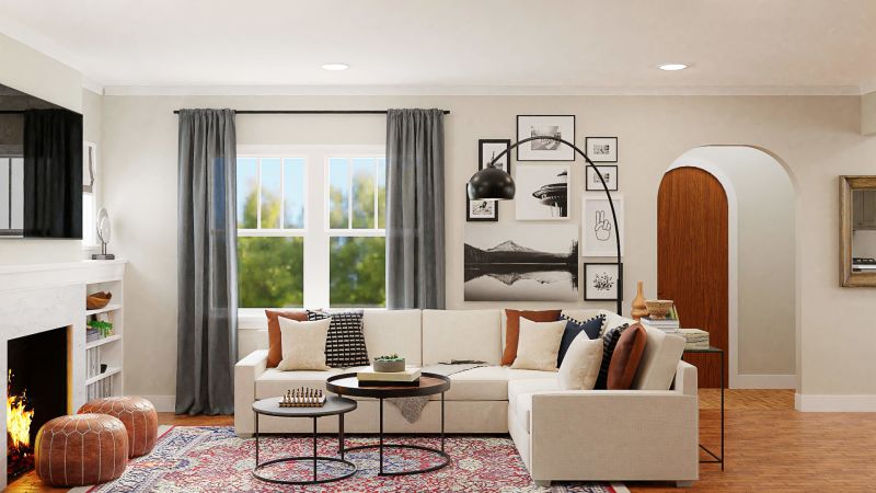 這個(gè)舒適的過渡客廳設(shè)計(jì)溫暖而溫馨,有多種座位可供選擇,尤其是深灰色角落部分。米色、白色和黃色的枕頭為沙發(fā)增添了色彩,使其更具吸引力。L形轉(zhuǎn)角截面也為房間帶來復(fù)古氣息。