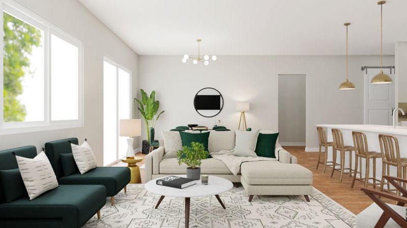 這種質(zhì)樸而舒適的現(xiàn)代客廳-餐廳設(shè)計(jì)采用美麗的中性色調(diào),幾乎沒有泥土色調(diào)。其白色為房間帶來平衡感。沙發(fā)裝飾有棕色、藍(lán)色和黑色的重點(diǎn)枕頭,以形成對(duì)比。