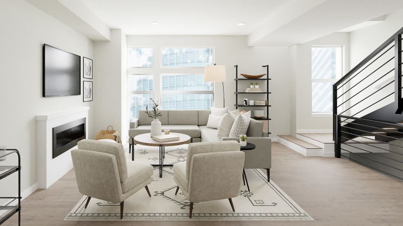 這間現(xiàn)代質(zhì)樸的客廳采用中性色調(diào),配有終端沙發(fā),深座椅和豪華誘人的室內(nèi)裝潢為整個(gè)房間帶來精致。為了增添色彩,搭配了黃色、黑色和橙色的重點(diǎn)枕頭。