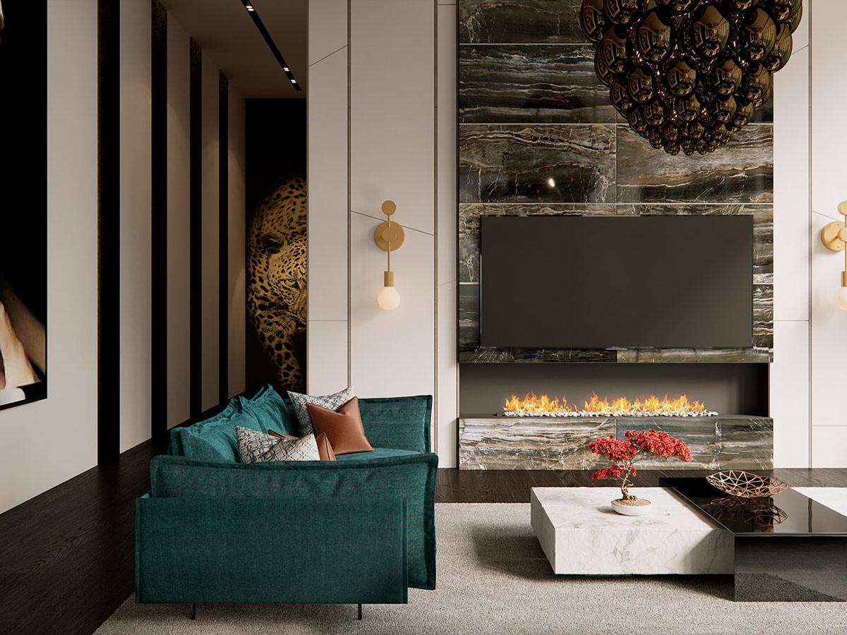 現(xiàn)代壁燈位于現(xiàn)代壁爐和壁掛式電視的兩側(cè)。