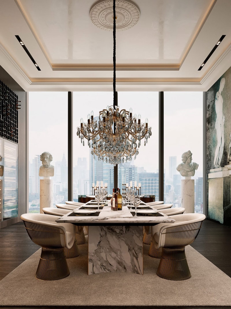 兩盞精致的餐廳枝形吊燈在桌子上方滴落著奪目的水晶。古典半身像裝飾了無邊窗的每一側(cè)。