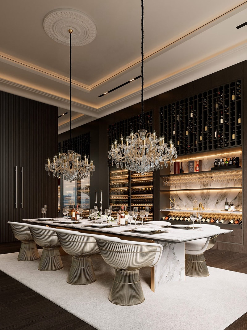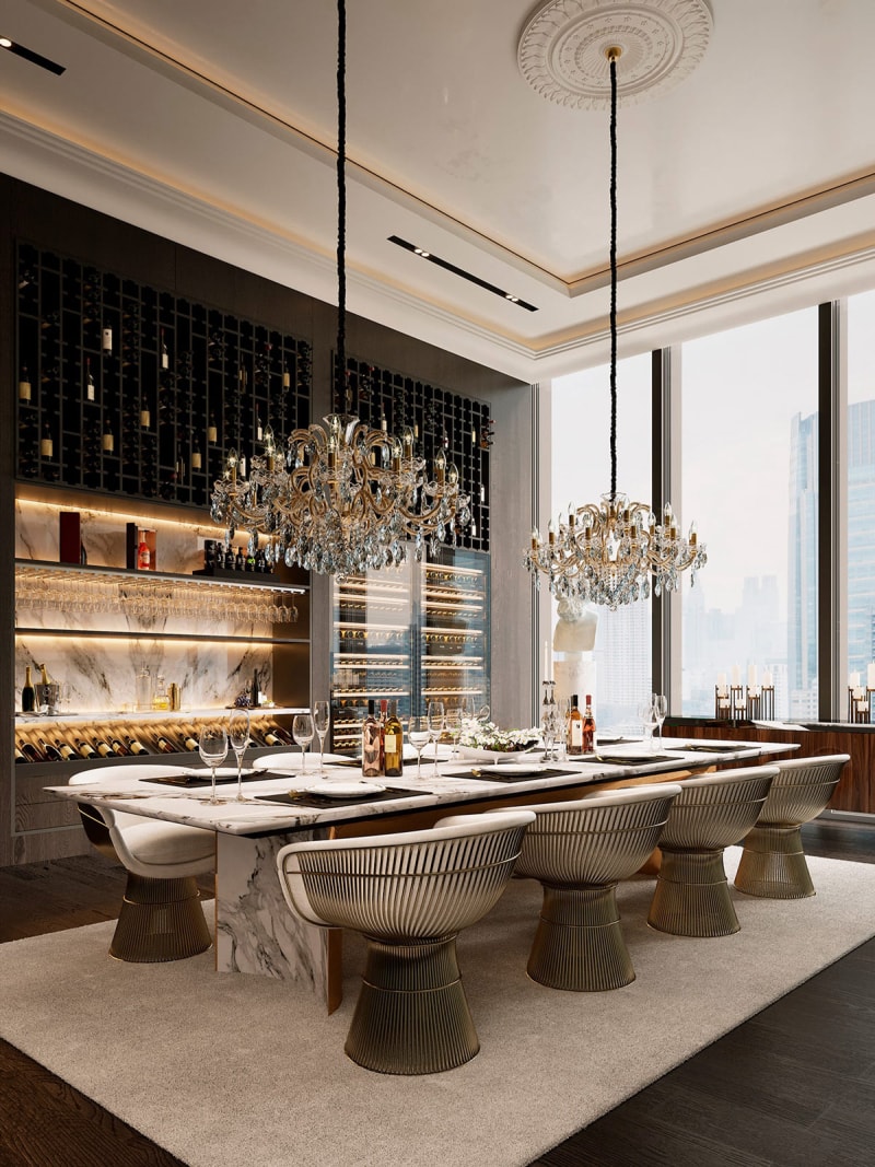 在豪華的餐廳里,一張大大理石餐桌舒適地為八位晚餐客人提供服務(wù)。別致的弧形餐椅是WarrenPlatner 為 Knoll 設(shè)計的Platner 扶手椅。