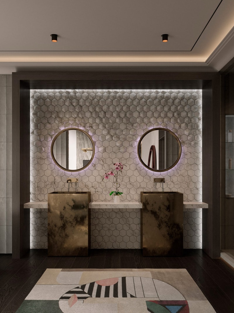 在套間內(nèi),大理石和黃銅雙水槽浴室梳妝臺在強烈的紫色氛圍燈下熠熠生輝。彩色照明從背光浴室鏡子發(fā)出,灑在現(xiàn)代幾何墻磚上。