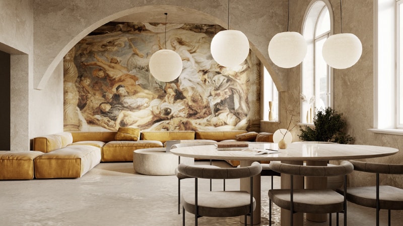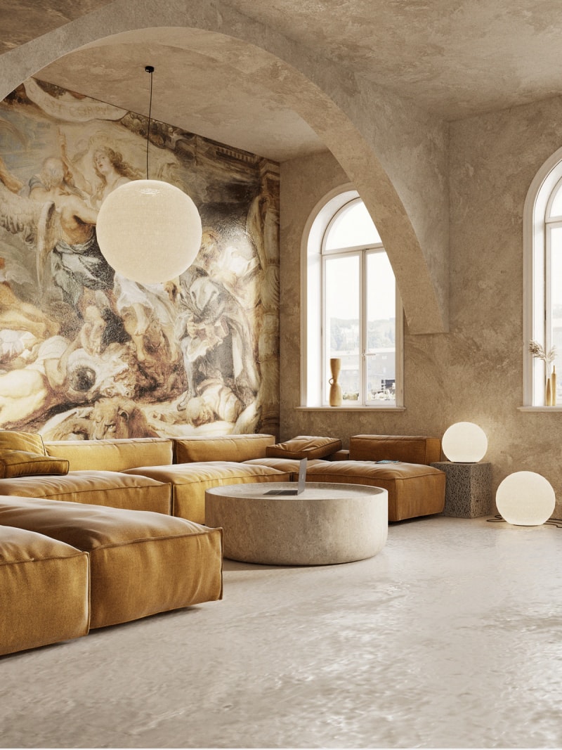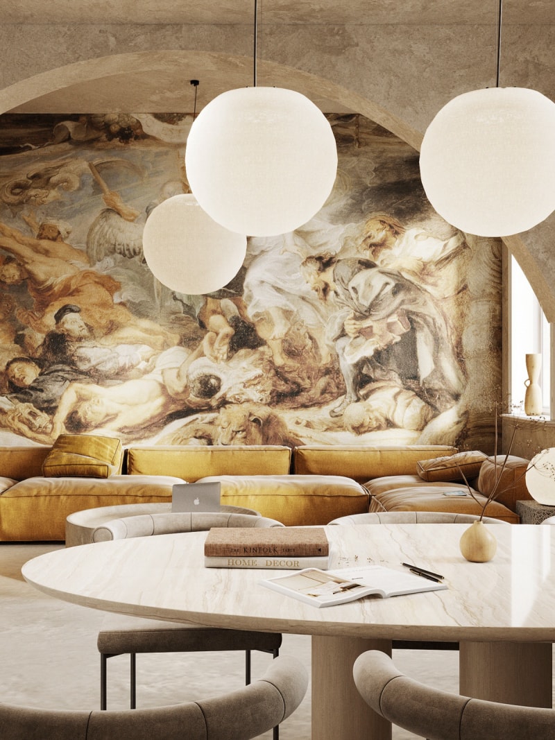 古典藝術(shù)和雕塑在這三個現(xiàn)代家居室內(nèi)設(shè)計中占據(jù)中心位置,增添了超越時間的吸引力和神秘。藝術(shù)作品為現(xiàn)代環(huán)境注入個性,營造文化,并營造出世俗而精致的氛圍。我們的一次家庭之旅將感受古典藝術(shù)作品與色彩繽紛的現(xiàn)代環(huán)境相結(jié)合,那里巨大而豪華的房間充滿了頹廢感。我們的第二次家庭之旅在引人注目的拱門下展開,拱門構(gòu)成了現(xiàn)代家具、當代照明和傳統(tǒng)壁畫的交匯處。后,我們將參觀的第三個家居設(shè)計將我們帶入未來,經(jīng)典藝術(shù)成為引人注目的未來廚房設(shè)計和獨特幾何家具和配件的背景。