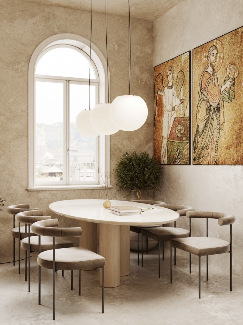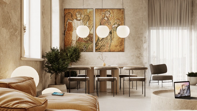 神圣的畫布為客廳餐廳組合的墻壁增光添彩。