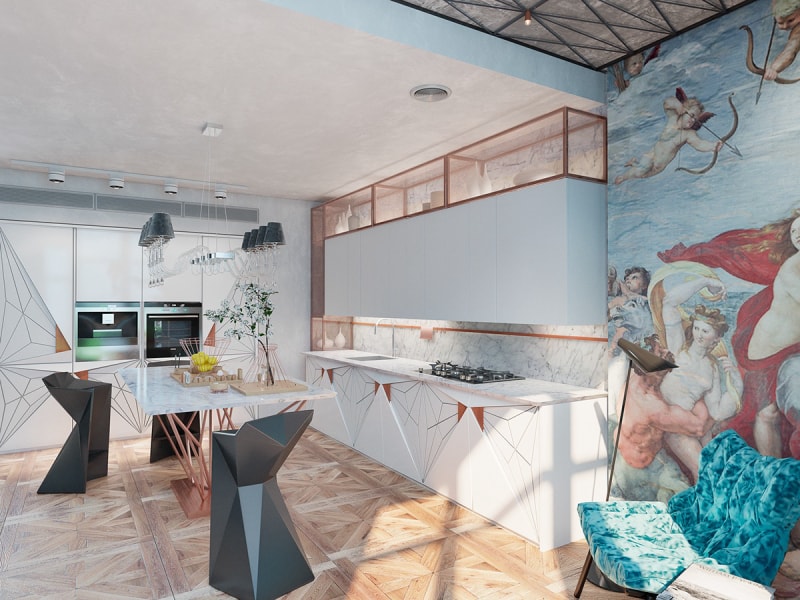 一幅古典的小天使壁畫為未來派廚房的美麗小閱讀角帶來一抹絢麗的色彩,營造出充滿想象力的假期。