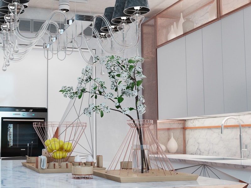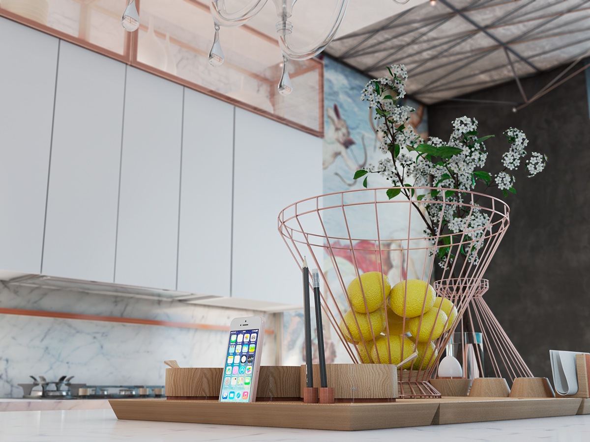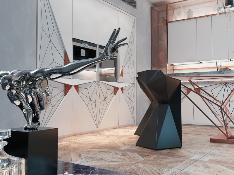 輪廓分明的廚房吧臺凳在未來派廚房設(shè)計中加入了幾何圖案網(wǎng)。幾何圖案和輪廓被雕塑藝術(shù)品的流暢線條所抵消。