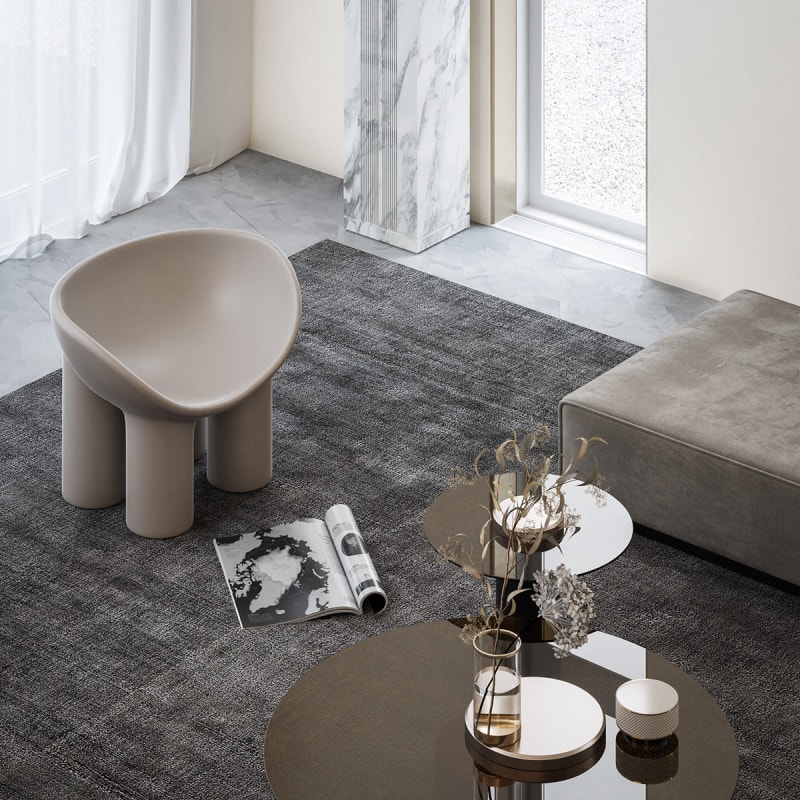 兩把雕塑般的椅子被放置在房間的盡頭,它們在明亮的窗戶上形成了剪影。