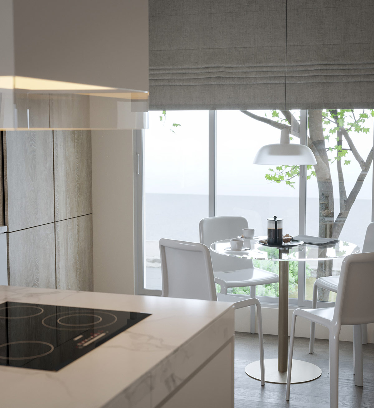 一張小玻璃廚房桌子在窗戶旁增添了輕巧的效果。精致的白色吊燈在視覺上將整潔的用餐區(qū)固定到位。